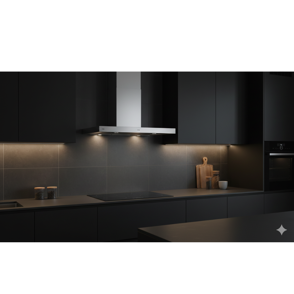 De RVS-afwerking zorgt voor een professionele, tijdloze uitstraling en is eenvoudig te reinigen. De geïntegreerde verlichting biedt helder zicht op de kookplaat en draagt bij aan comfortabel koken. De metalen vetfilters zijn uitneembaar en gemakkelijk schoon te maken, wat het onderhoud beperkt.